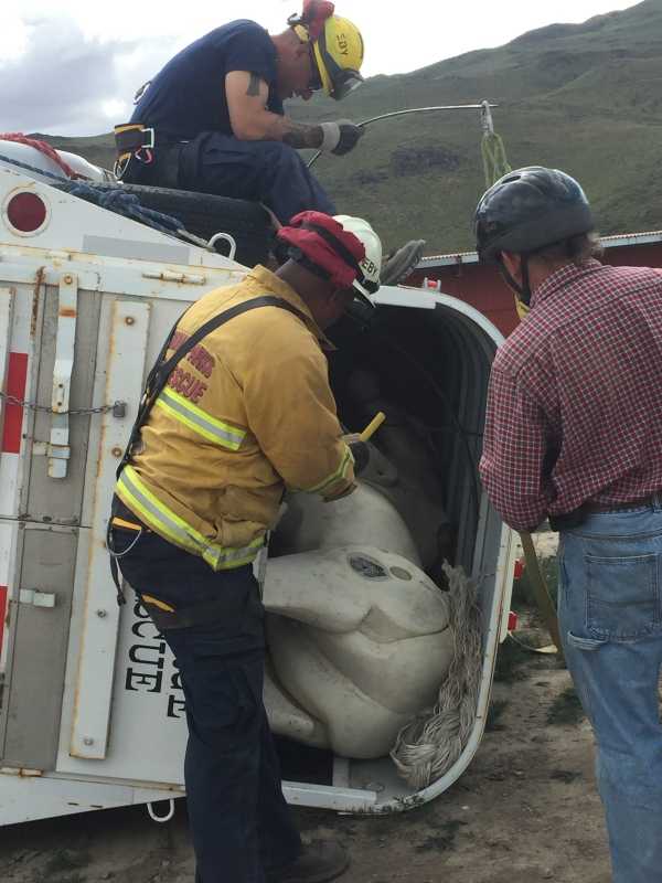 Trailer accidents can be extremely tricky incidents that usually require methodically reasoned approaches to resolve. Horses are often trapped in confined spaces and entering those spaces to remove horses can be particularly risky. Sometimes the safest and most practical approach is to carefully return the trailer to its upright position with the animal(s) inside. (See